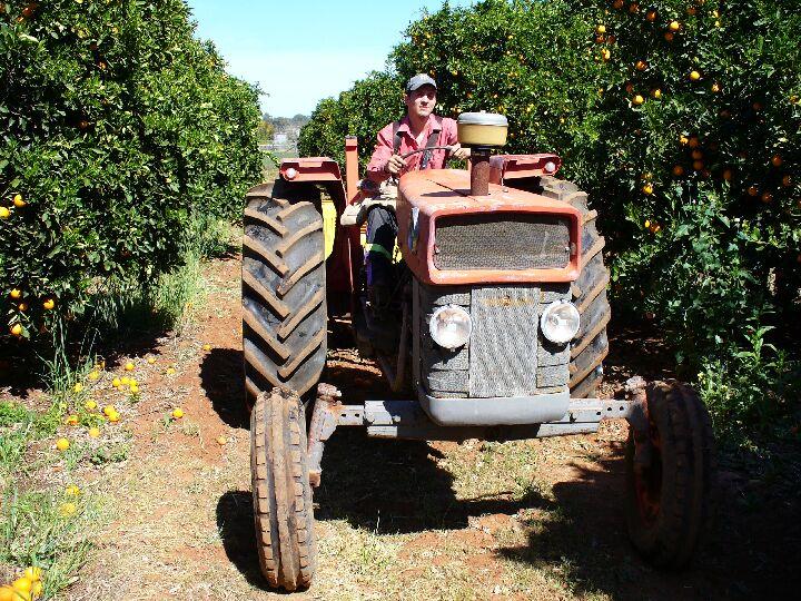 Marcus beim Traktor fahren zwischen den Orangenbäumen