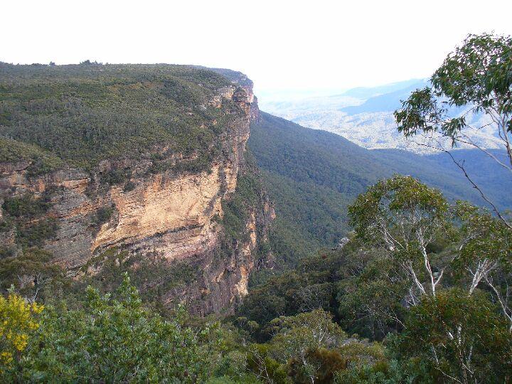 Blick auf die Blue Mountains vom Wentworth Wasserfall